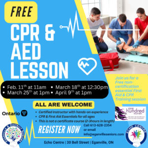 Category Community Events Date Feb 11 2026 Time 11:00 am Free Community CPR and AED Lessons Echo Centre – 30 Bell St. Eganville. Click here for registration info. Register Now: CALL – 613-628-2354 EMAIL – info@eganvilleseniors.com Bonnechere Cup Snowmobile Races – 50th Anniversary – February 7 & 8 – Bonnechere Cup Races Facebook × Share this event + Add to Google Calendar + iCal / Outlook export 00 days 00 hours 00 minutes 00 seconds