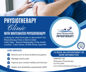 Location ECHO Centre 30 Bell St. Eganville Website https://www.eganvilleseniors.com/ Category Community Events Date Feb 11 2026 Whitewater Physiotherapy Clinics – Second Wednesday of the Month – Echo Centre – 30 Bell St. Eganville – Book Appointment – 613-647-2699 Bonnechere Cup Snowmobile Races – 50th Anniversary – February 7 & 8 – Bonnechere Cup Races Facebook × Share this event + Add to Google Calendar + iCal / Outlook export 00 days 00 hours 00 minutes 00 seconds